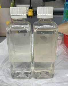 La photo ci-dessus montre deux échantillons d’eau prélevés dans le cadre du suivi de la situation :