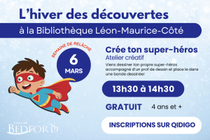 Dans le cadre de l’Hiver des découvertes à la bibliothèque, viens dessiner ton propre super-héros accompagné d’un professeur de dessin! Place-le ensuite dans une bande dessinée.